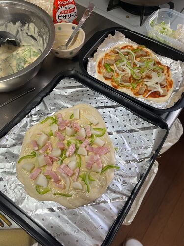 『ピザ』 1枚目 冷凍ハンバーグ、玉ねぎ、ピーマン、ピザソース 2枚目 ベーコン、餅、玉ねぎ、ピーマン、マヨネーズと焼肉のタレを混ぜたソース 『大根サラダ』 千切りした大根は水にさらし、水気を切る。かいわれも入れ、オリーブオイル、ハーブソルト、マ…