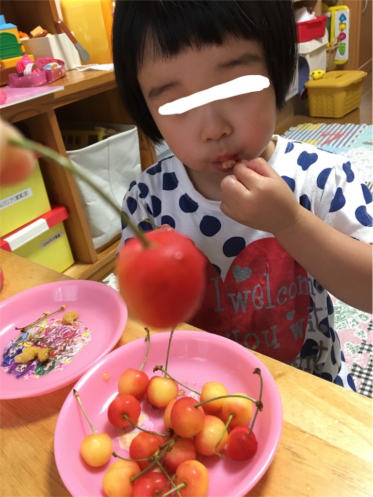 すずっぺ:「お父さん、さくらんぼ🍒の食べ方知らないでしょー。こうするんだよ、見ててね。見ててよーちゃんと」と食べるのを見せて